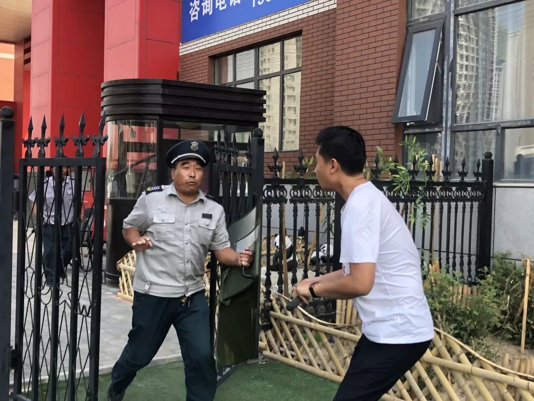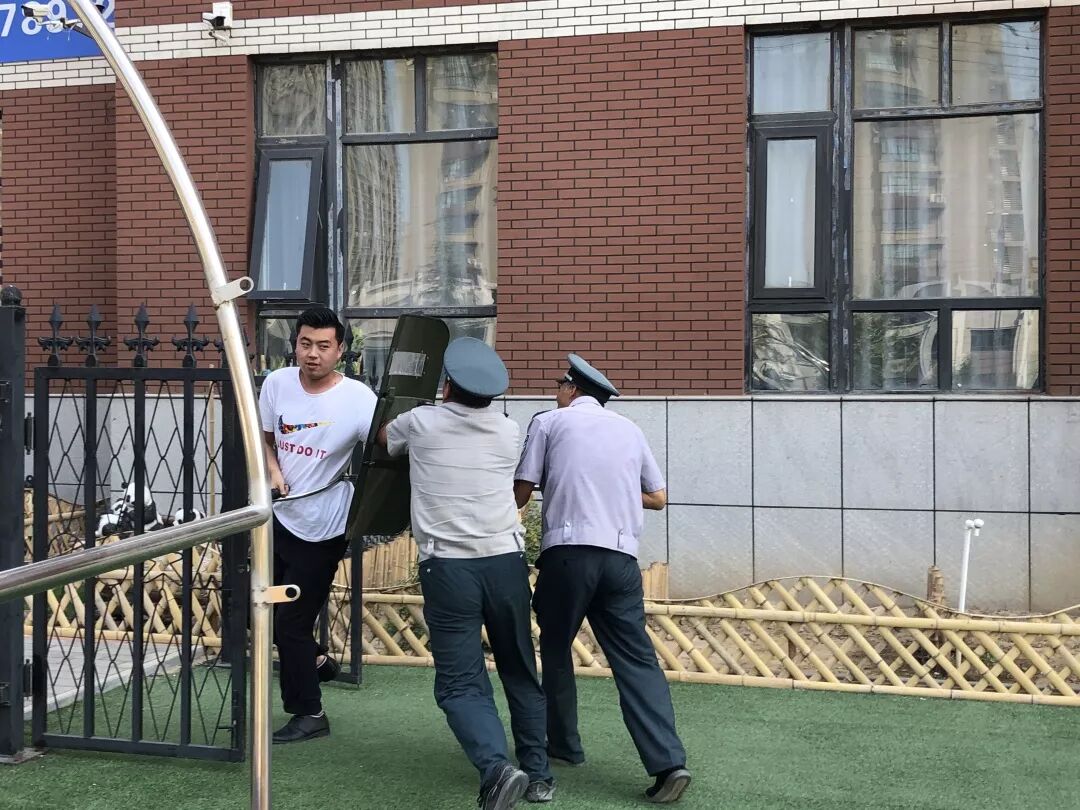 园内门卫及保安在第一时间拿起防护钢叉、棍子,极力制止“歹徒”行凶,最终将“歹徒”制服。